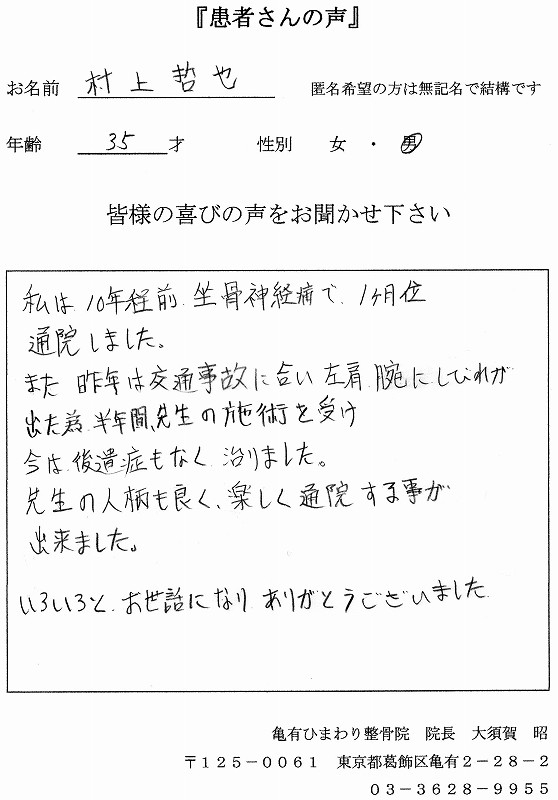 私は10年前程前、坐骨神経痛で1ヶ月位通院しました。 また昨年は交通事故に合い左肩、腕にしびれが出た為半年間、先生の施術を受け、今は後遺症もなく治りました。 先生の人柄も良く、楽しく通院する事が出来ました。