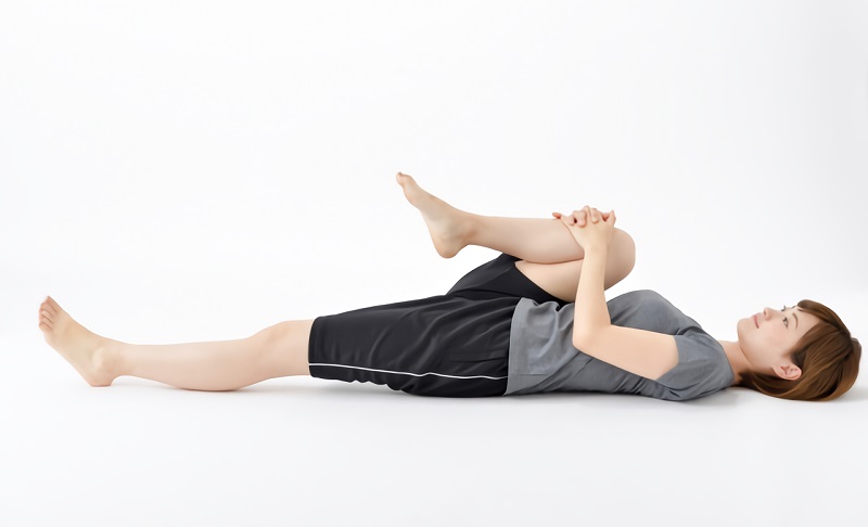 仰向けの姿勢で床に横になり、片膝を抱えた状態で、臍に向かって上方及び後方へ、息を吐きながら、引き寄せます。