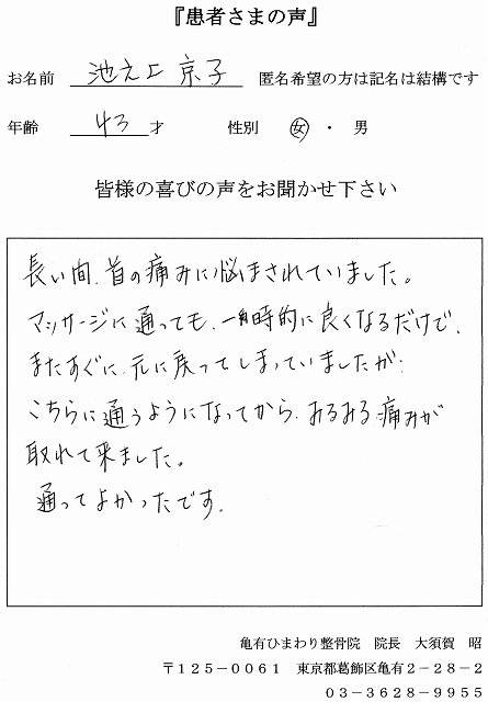 ●【頭痛/首の痛み/腰痛】が改善された患者さん(葛飾区亀有在住、池ノ上 京子様、40代、女性)