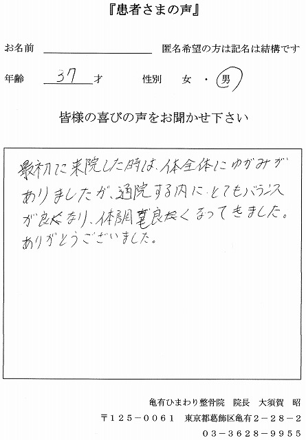 「通院する内にとてもバランスが良くなり、体調も良くなってきました。」