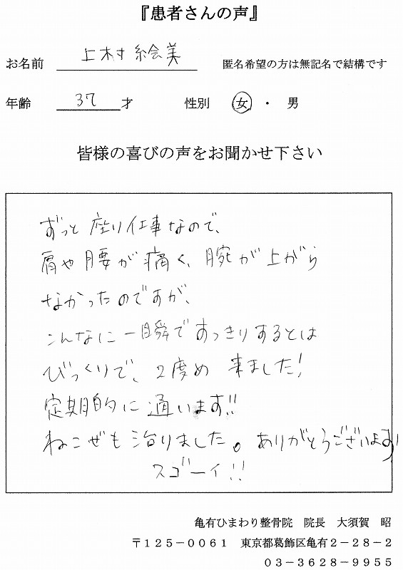 ●【肩こり/腰痛/肩の痛み/猫背】が改善された患者さん(新宿区在住、上村 絵美様、30代、女性)